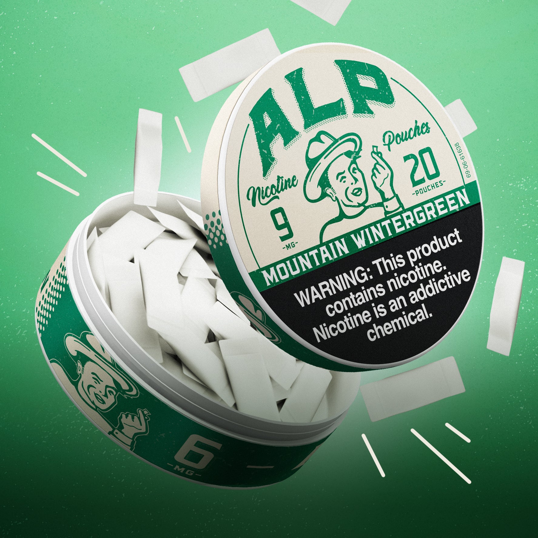ALP Chilled Mint nicotine pouches tin with a retro design, surrounded by individual pouches and a warning labe