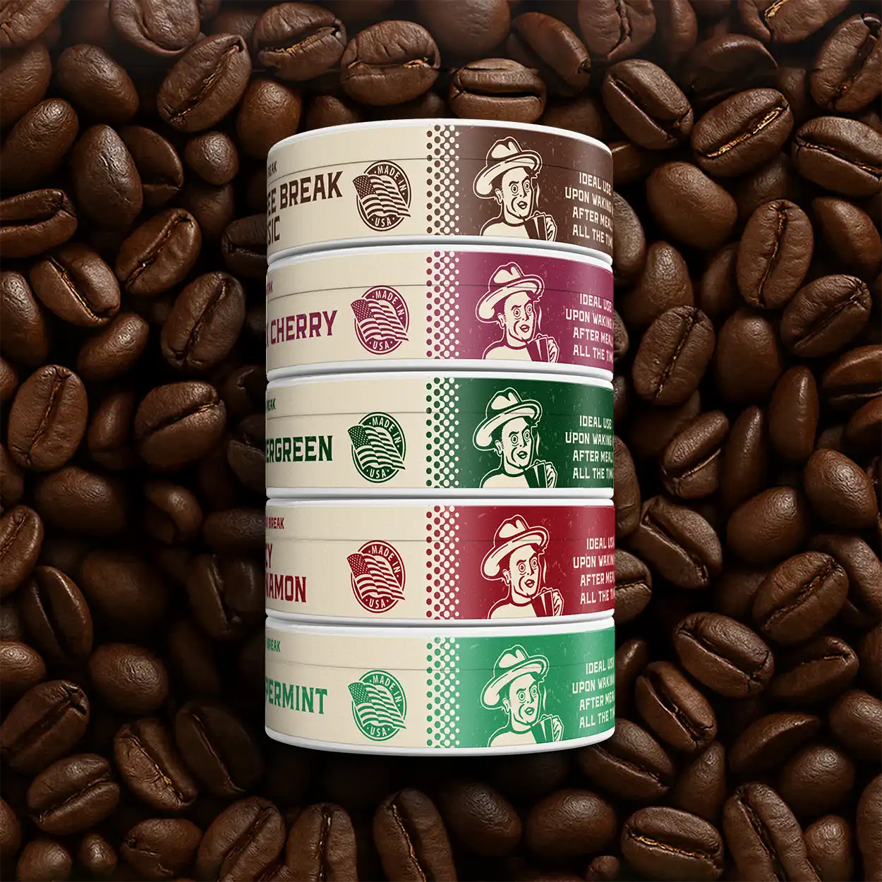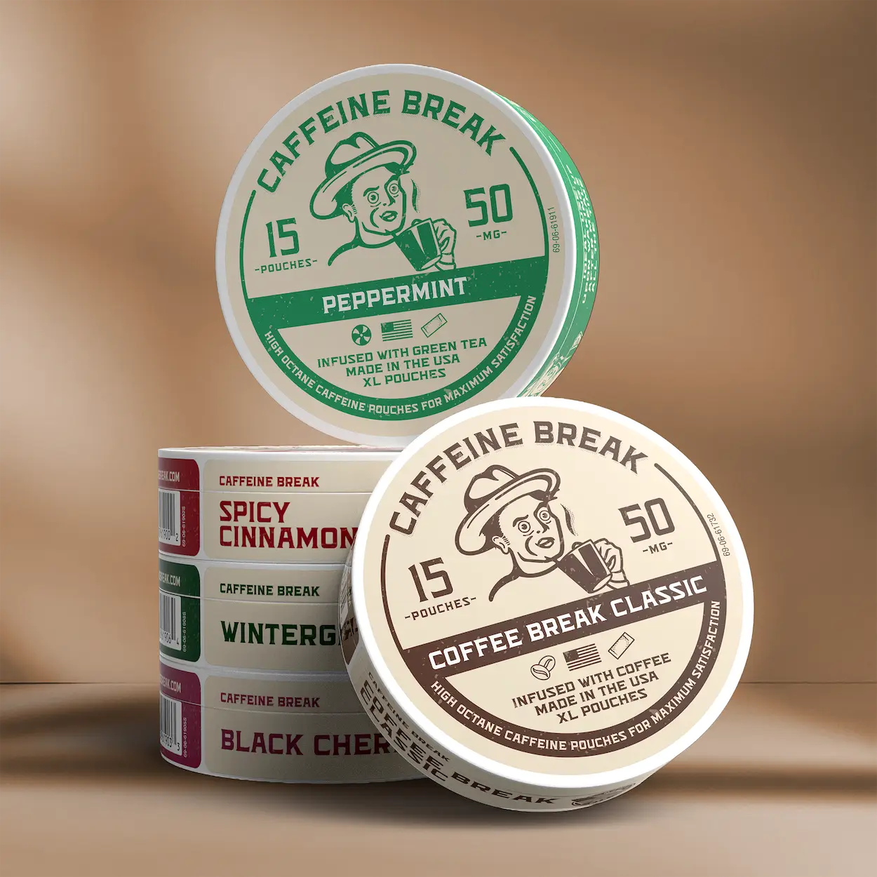 Experience the full Caffeine Break lineup, all at once. The Caffeine Break Combo Pack brings together all 5 flavors: Wintergreen, Black Cherry, Coffee Break Classic, Spicy Cinnamon, and Peppermint. That’s 25 tins, 375 total pouches, and 18,750mg of caffeine, with 20% off already baked into the price.